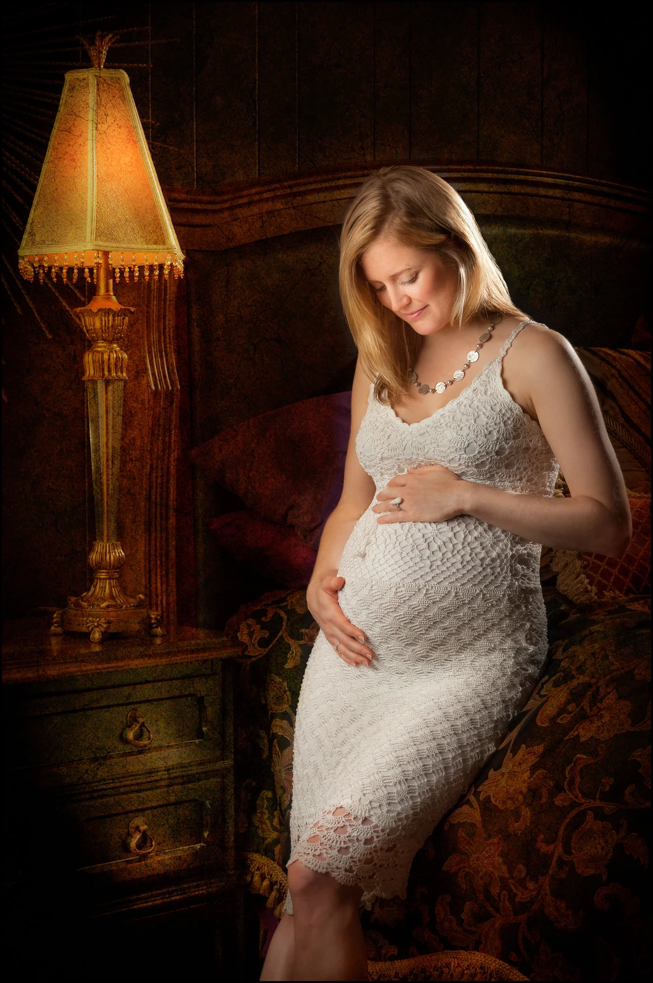 A pregnant woman in a white lace dress is sitting on a bed, looking down at her belly, with her hand resting on her stomach. View fullsize